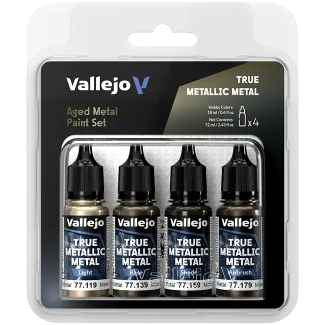 The True Metallic Metal: Aged Metal Paint Set contains 4 dropper bottles of 18ml with acrylic paint from the True Metallic Metal range from Vallejo. The colors in this set work beautifully together for a muted brownish metallic tone designed to evoke weathered, time-worn surfaces. Perfect for war machines, sci-fi panels, medieval armor or scenery elements.