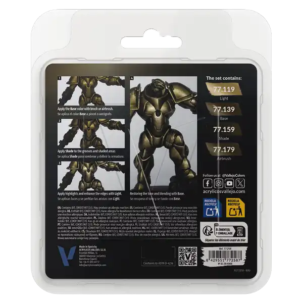 The 4-color sets offer a compact and organized way to work with each chromatic family. Each set includes the four tones that compose it – BASE, LIGHT, SHADE and AIRBRUSH – providing a complete and logical solution for painting metals in a specific hue.
