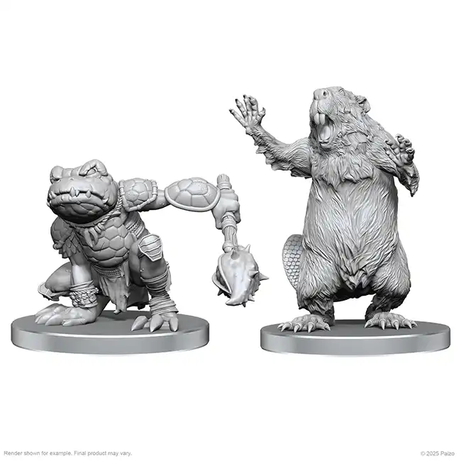Two highly detailed miniatures of a Boggard Scout & Castoroides, suitable for Pathfinder RPG, D&D or any other fantasy game.