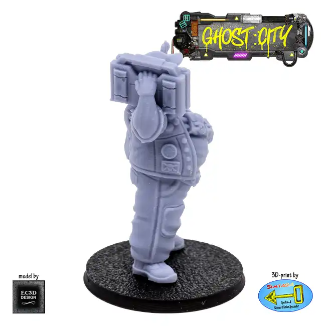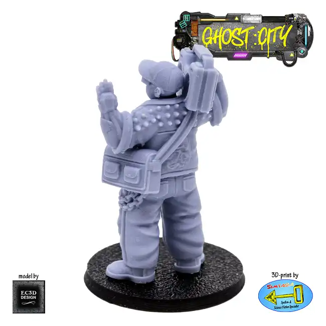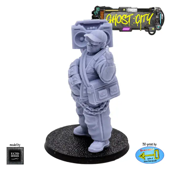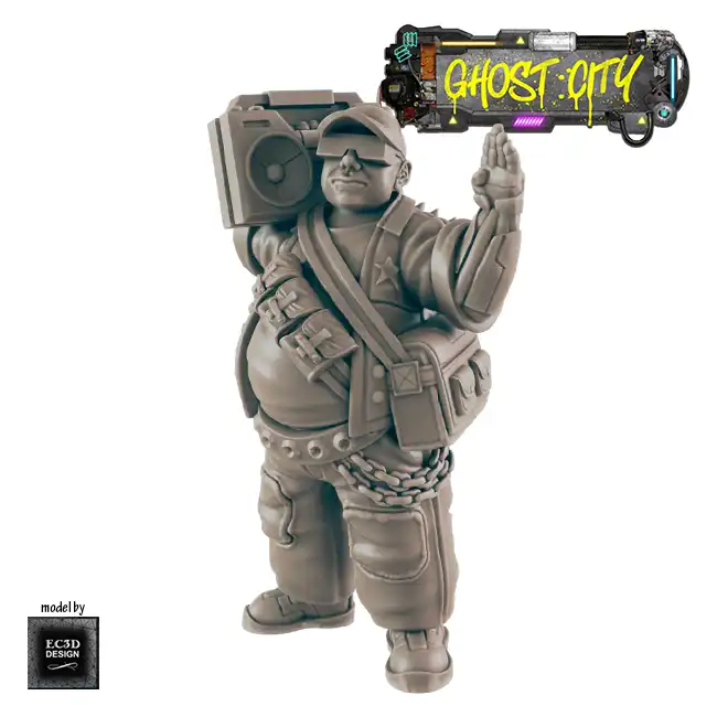 A detailed resin print of a Boombox Guy, a big guy with a ghetto blaster, suitable for Roleplaying Game or diorama.