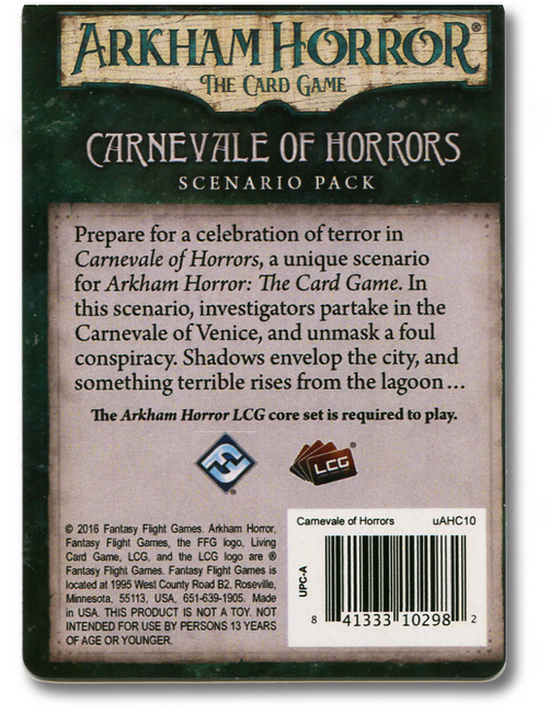 The sixty-two card, standalone scenario in Carnevale of Horrors transports you to a city of masks and mysteries. While revelers throng the streets of Venice, masked conspirators advance their sinister agendas, shadows envelop the city, and something terrible rises from the lagoon…