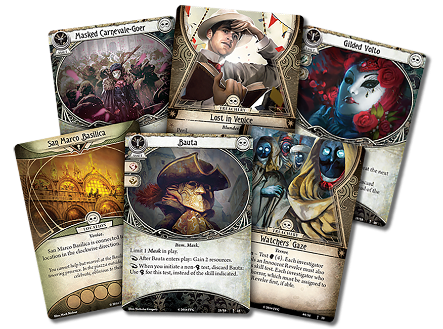 Carnevale of Horrors comes with all the act, agenda, location, and encounter cards that you need to enjoy its adventure. Additionally, five player cards—one ally and four Mask assets—enrich your campaign experience after you complete your investigations in Venice.