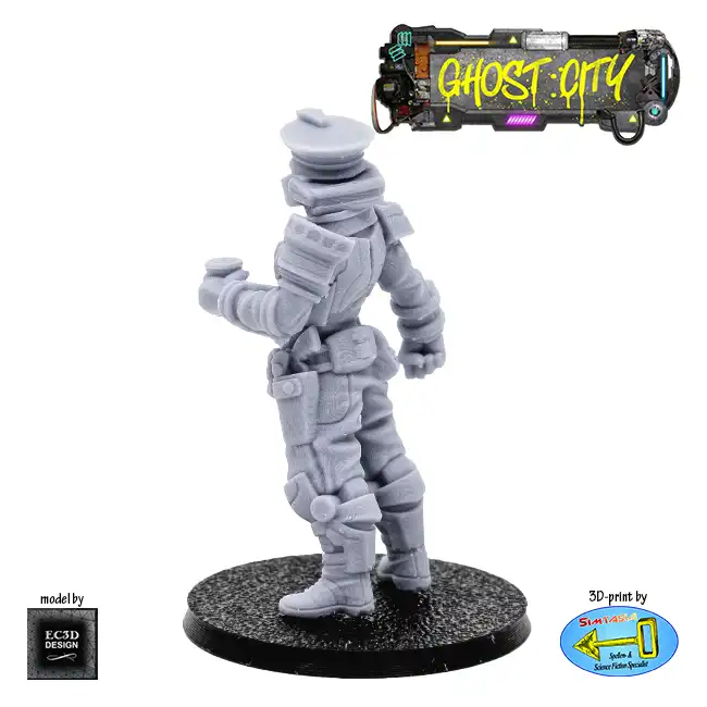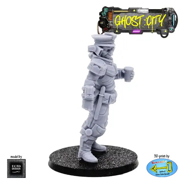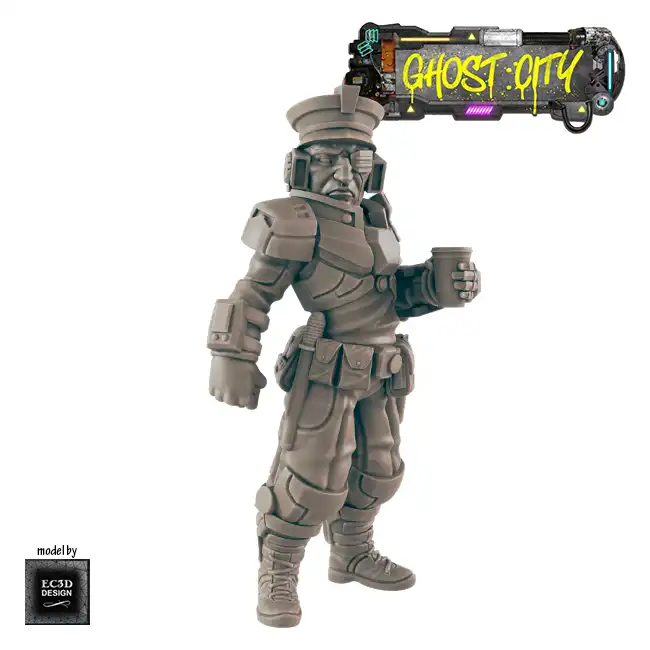 A detailed resin print of a Coffee Cop (Male Officer 3), a police officer holding a cup of coffee, suitable for Roleplaying Game or diorama.