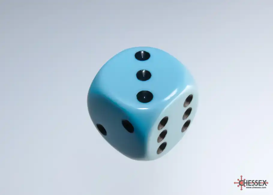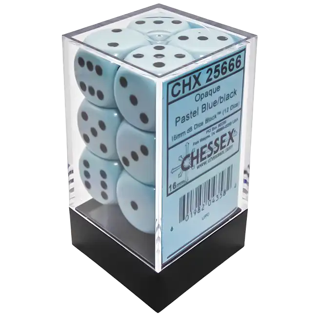 This set contains 12 Opaque Pastel Blue 16mm D6 dice with black pips in Display Cube w/Lid and Foam Square