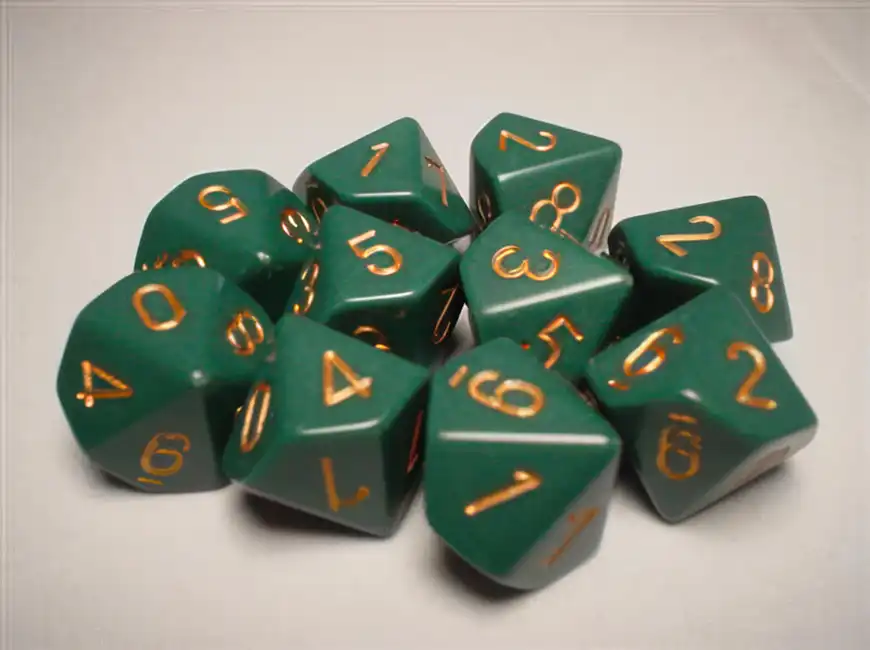 Contains 10 Opaque Dusty Green d10 dice with copper numbers in Plastic Clamshell.