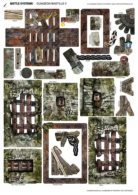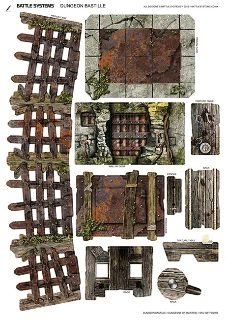 This Dungeon Bastille set expands your dungeon with prison and torture chamber themed terrain, from walls and doors fitted with iron bars, to alarm bells, chains, prison bunks, and a torture chamber complete with a rack. It works in conjunction with the rest of the Battle Systems Dungeon range.
