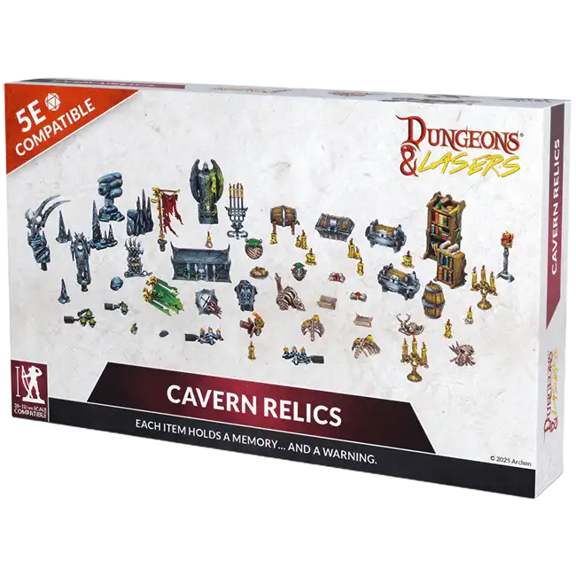 Dungeons & Lasers: Cavern Relics bevat 54 zeer gedetailleerde miniaturen van zaken zoals een (offer)altaar, kisten, vaten, kasten, kandelaars, enz.