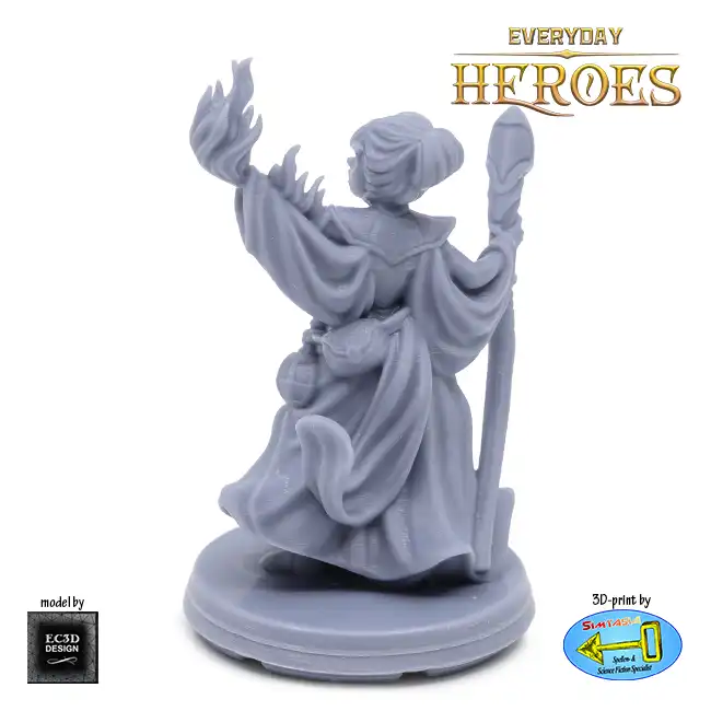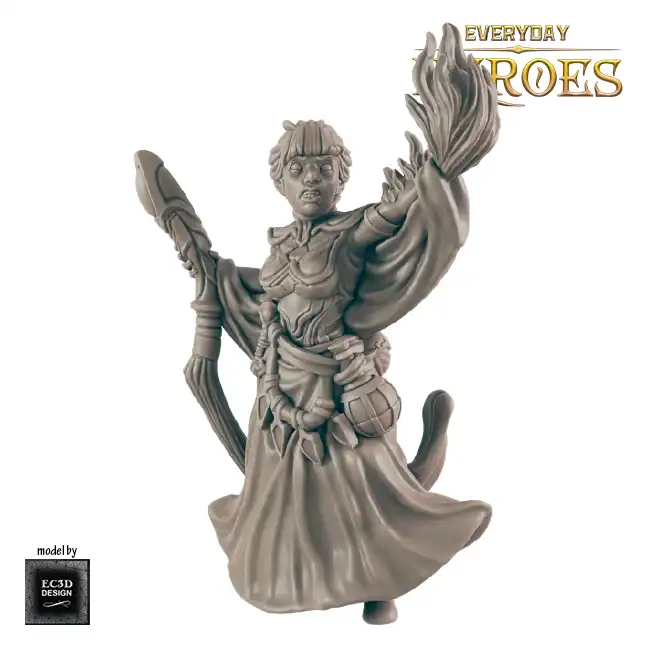 A detailed resin print of a Female Half-Elf Wizard with staff and fireball, suitable for Roleplaying Game or diorama.