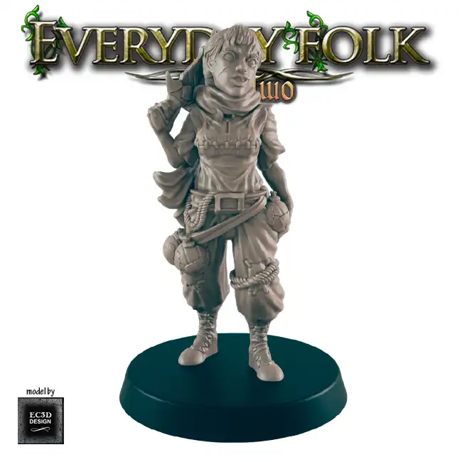 A detailed resin print of a Female Human Bandit, suitable for Roleplaying Game or diorama.