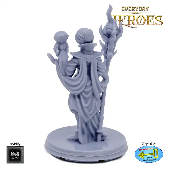 A detailed resin print of a Female Human Warlock with staff and animal companion, suitable for Roleplaying Game or diorama.