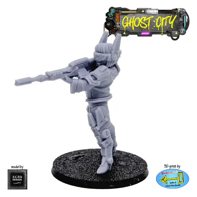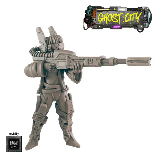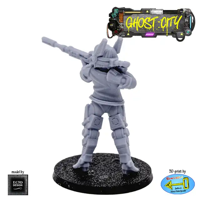 A detailed resin print of a Female Sniper, with VR visor, suitable for Roleplaying Game or diorama.