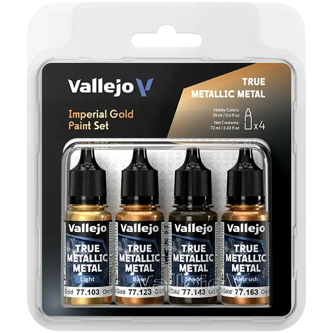 The True Metallic Metal: Imperial Gold Paint Set contains 4 dropper bottles of 18ml with acrylic paint from the True Metallic Metal range from Vallejo. The colors in this set work beautifully together for a warm, deep gold with orange undertones. Perfect for ornaments, fantasy armor, noble characters or historical miniatures.