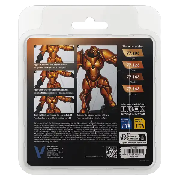 The 4-color sets offer a compact and organized way to work with each chromatic family. Each set includes the four tones that compose it – BASE, LIGHT, SHADE and AIRBRUSH – providing a complete and logical solution for painting metals in a specific hue.