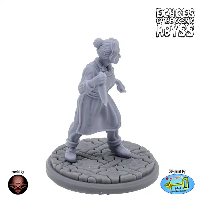 A detailed resin print of a female Chef, with a chef’s knife at the ready, suitable for Role Playing Games, Tabletop, Wargames or diorama.