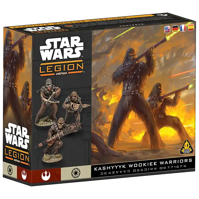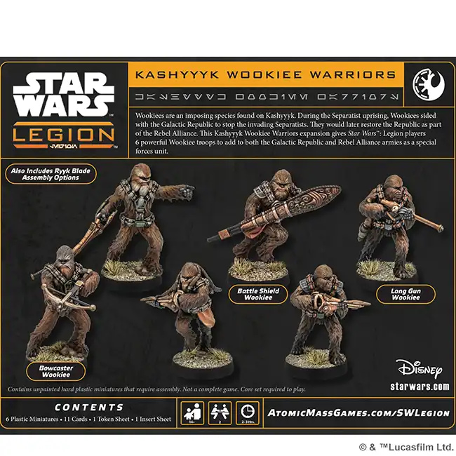 Wookiees are an imposing species found on Kashyyyk. During the Separatist uprising, Wookiees sided with the Galactic Republic to stop the invading Separatists. They would later restore the Republic as part of the Rebel Alliance. This Kashyyyk Wookiee Warriors expansion gives Star Wars™: Legion players 6 powerful Wookiee troops to add to both the Galactic Republic and Rebel Alliance armies as a special forces unit.