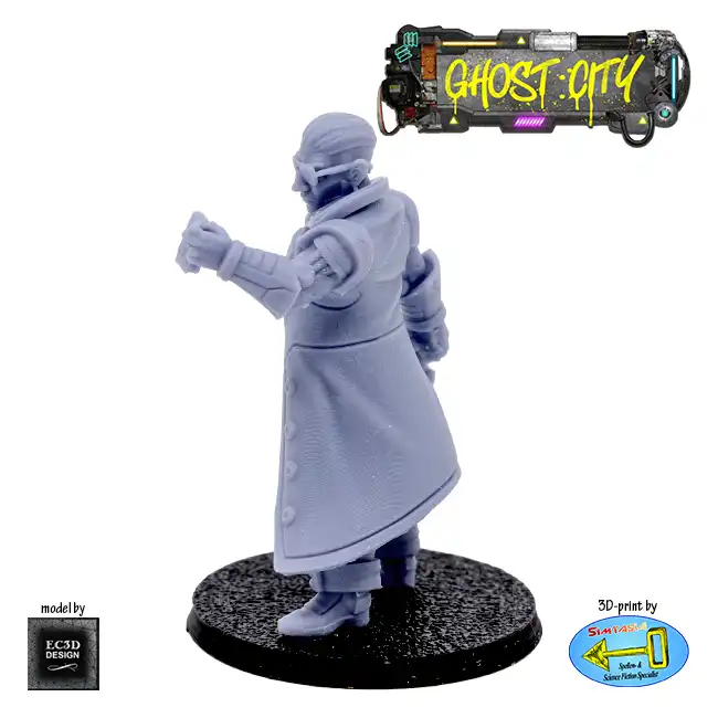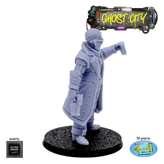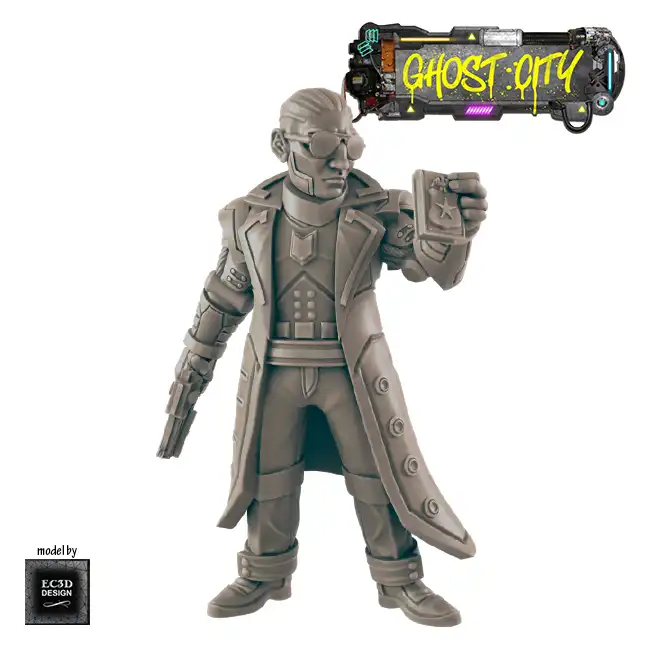 A detailed resin print of a Male Detective, police detective with badge and drawn gun, suitable for Roleplaying Game or diorama.