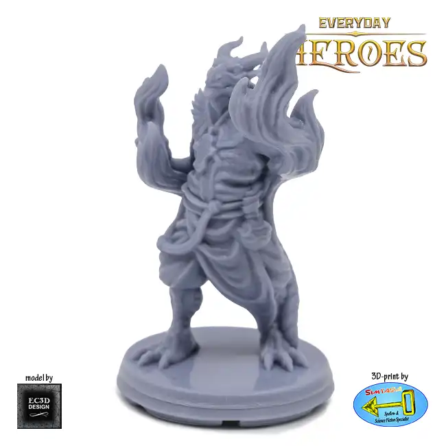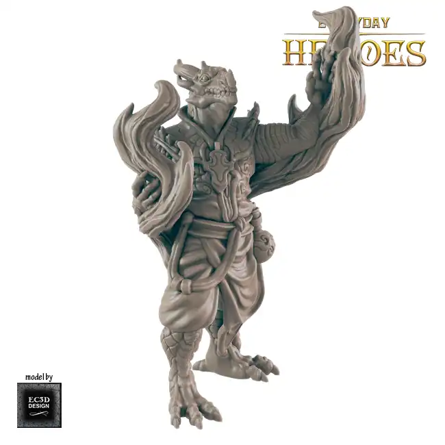 A detailed resin print of a Male Dragonkin Sorcerer casting a spell, suitable for Roleplaying Game or diorama.
