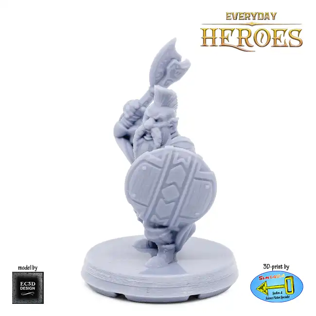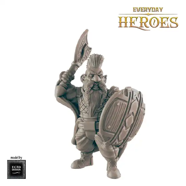 A detailed resin print of a Male Dwarf Fighter, armed with battle-axe and shield, suitable for Roleplaying Game or diorama.