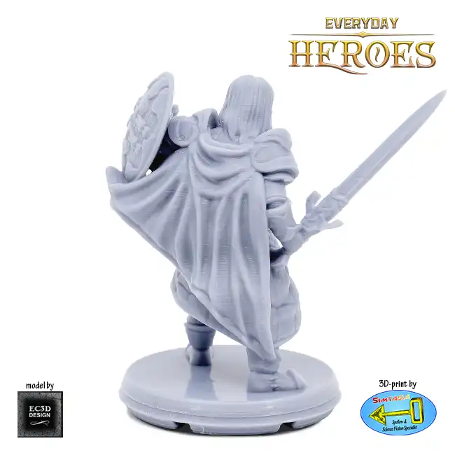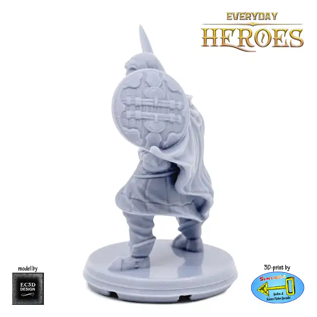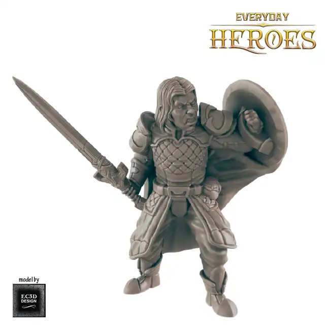 A detailed resin print of a Male Human Fighter with sword and shield, suitable for Roleplaying Game or diorama.
