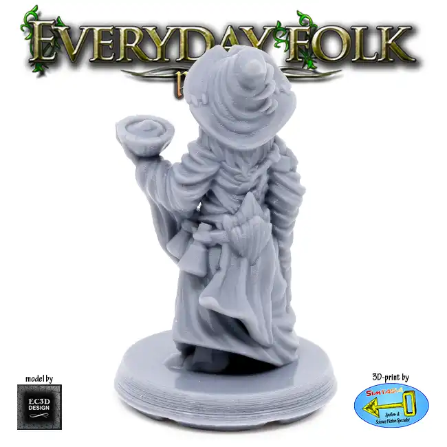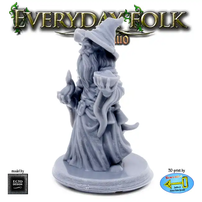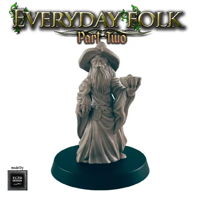 A detailed resin print of a Male Human Hedge Wizard, suitable for Roleplaying Game or diorama.