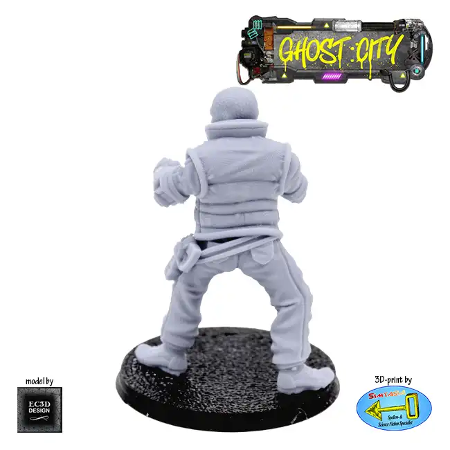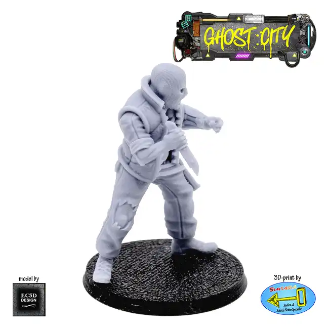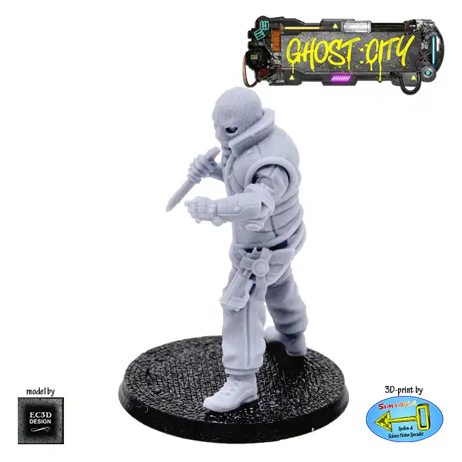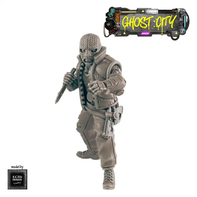 A detailed resin print of a Male Masked Criminal, armed with a knife and meaning business, suitable for Roleplaying Game or diorama.