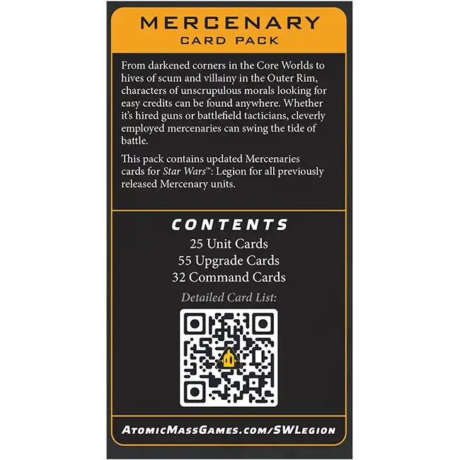 - UNLEASH MERCENARY POWER: The Mercenary Card Pack enhances your Star Wars: Legion game with updated Unit, Command, and Unit-specific Upgrade cards for previously released mercenary units.