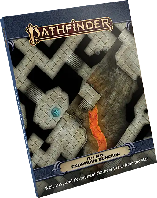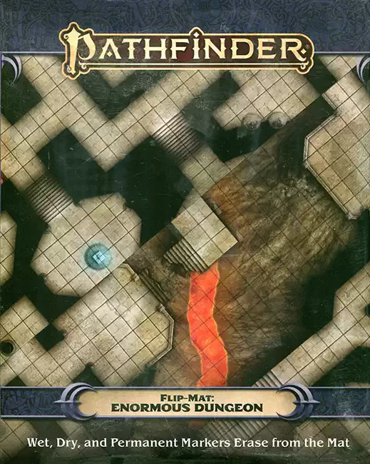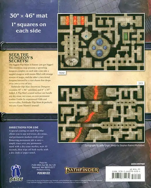 What’s better than a brand new dungeon Flip-Mat to explore? The BIGGEST dungeon Flip-Mat of all time, of course! This enormous 30″ x 46″ map presents two sprawling dungeon complexes—one on each side—to vex and intrigue your players. Unveil this titanic dungeon on your tabletop and watch as your players are staggered by the awesome challenges ahead! Their party’s biggest problems just got even bigger!