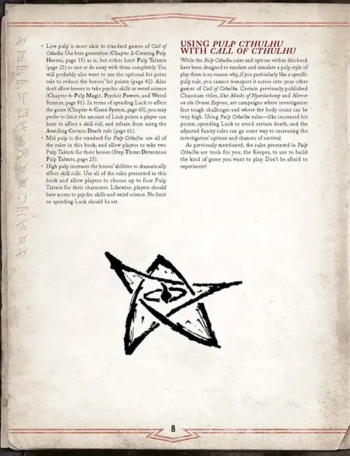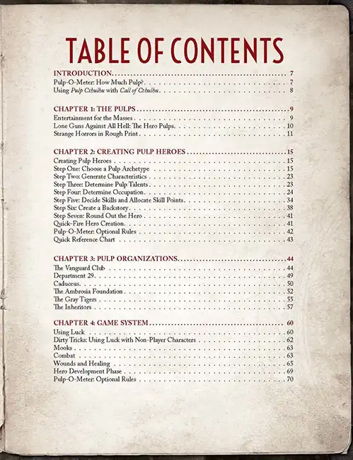 Pulp Cthulhu is a game of two-fisted adventure, weird science, dark deeds, and brave heroes. With this book, some roleplaying dice, and the Call of Cthulhu Rulebook, you have everything you need to adventure and explore games set in the pulp genre.