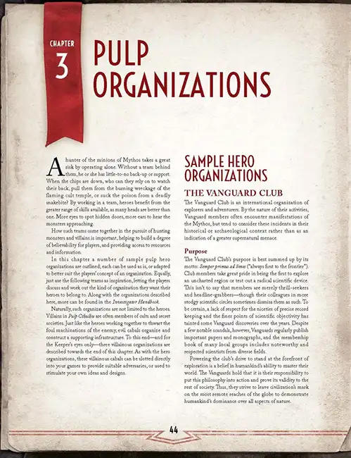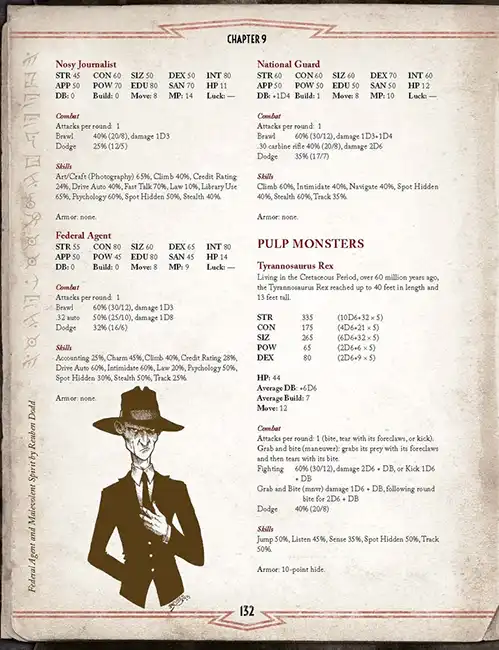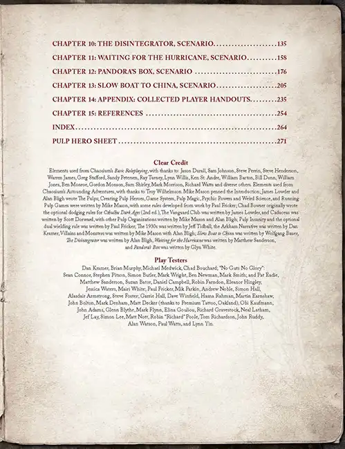 Here you will find an adapted character generation system, rules for psychic powers, sanity, augmented skills, and weird science, as well as tips for Keepers on developing and running pulp-style games. Also, you will find information on “the Pulps” themselves and the 1930s era when America was in the grip of the Great Depression and on the road to World War II. A collection of pulp villains and monsters, and a range of pulp organizations provide the Keeper with a firm basis for running pulp style scenarios and campaigns. Four action-packed scenarios round out the book, getting your Pulp Cthulhu games started with a bang.