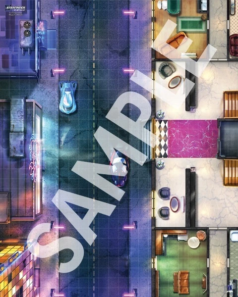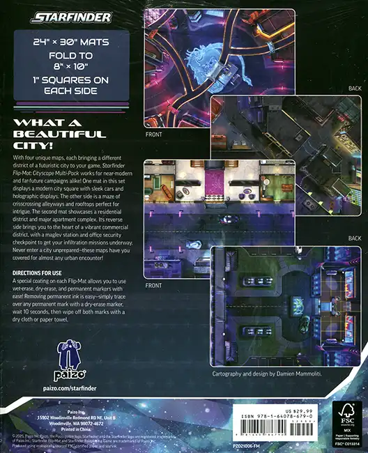 This Starfinder Flip-Mat: Cityscape Multi-Pack includes two double-sided tactical maps, with each map face depicting a different district in a sprawling futuristic city! One side features a modern city square with holographic displays. Another presents a maze of crisscrossing alleyways and rooftops perfect for intrigue. A third offers a residential district and major apartment complex, while the fourth side unveils the heart of a vibrant commercial district, with a maglev station to serve as the perfect departure point for any number of destinations and adventures. The ideal maps for any futuristic or near-modern game, this set has you covered for almost any urban encounter!
