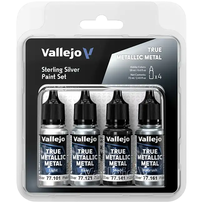 The True Metallic Metal: Sterling Silver Paint Set contains 4 dropper bottles of 18ml with acrylic paint from the True Metallic Metal range from Vallejo. The colors in this set work beautifully together for a neutral and pure silver tone suitable for any purpose. Ideal for armor, weapons, machinery or as a base for mixing with other colors.