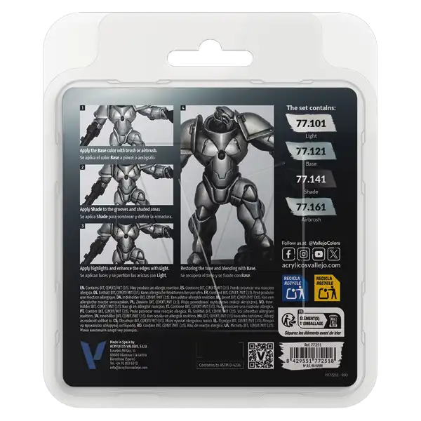 The 4-color sets offer a compact and organized way to work with each chromatic family. Each set includes the four tones that compose it – BASE, LIGHT, SHADE and AIRBRUSH – providing a complete and logical solution for painting metals in a specific hue.